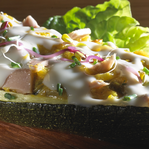 Lo cocinamos hasta que espese la salsa besamel y añadimos los mejillones enteros y el bonito del norte Campos desmigado. Probamos para rectificar de sal si fuera preciso y rellenamos los calabacines con la bechamel con verduras y cubrimos con 2 medias lonchas de queso cheddar. Horneamos a 250º durante 10 minutos y emplatamos sobre salsa de tomate frito.