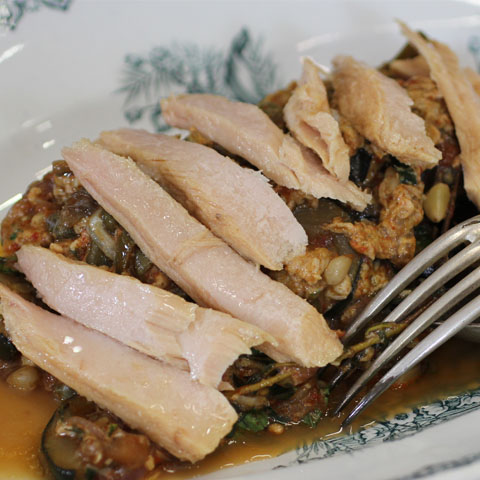 Añadir una pizca de aceite y saltear los calabacines. Incorporar el tomate, el azúcar, los piñones, las berenjenas y los calabacines y sofreír 10 minutos. Picar el perejil y la albahaca sobre la tabla. Añadir una pizca de vinagre, las alcaparras, el perejil, la albahaca y rectificar la sazón. Batir los huevos y mezclarle la caponata, hacer un revuelto al fuego.
