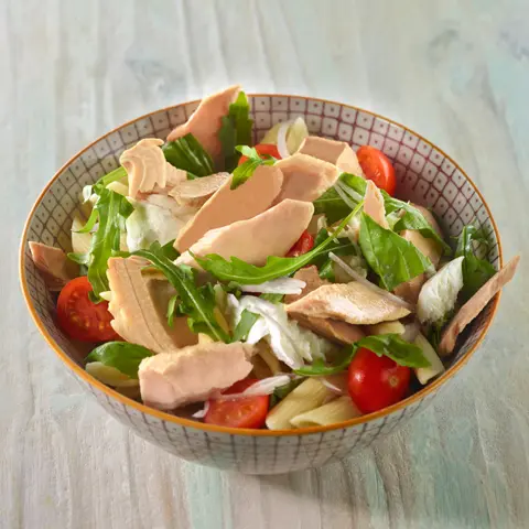 Partimos los tomates cherry por la mitad, y los introducimos en el bol. Cortamos a mano las hojas de albahaca, y las añadimos. Separamos las lascas del Atún Claro Campos y también las incorporamos. Añadimos las chalotas cortadas en tiras muy finas, la mozzarella cortada a mano, la pasta cocida y un chorrete de aceite de oliva, y removemos bien.