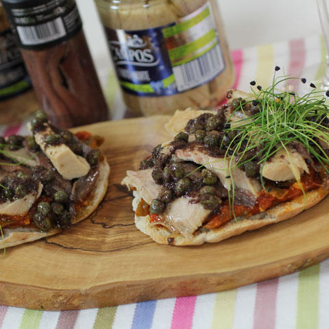 Transcurrido este tiempo, añadir el tomate y guisar otros 10 minutos más. Cortar la pita en dos discos y meterlos en la tostadora. En un bol mezclamos la ralladura de la piel del limón con su zumo exprimido, las alcaparras, la pasta de aceitunas, el vinagre, el aceite, sal y pimienta. Mezclamos todo.